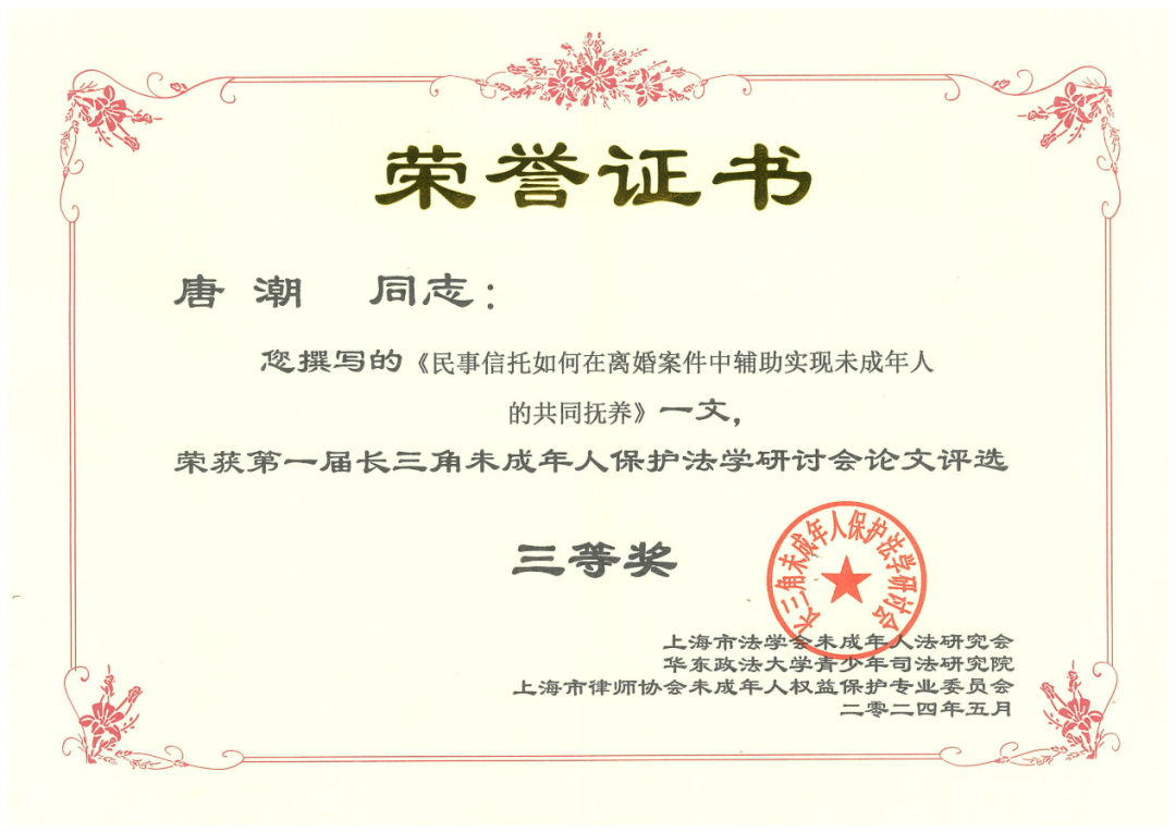 2024年5月18日,第一届长三角未成年人保护法学研讨会在上海举办。研讨会由上海市法学会未成年人法研究会、华东政法大学青少年司法研究院和上海市律师协会未成年人权益保护专业委员会联合主办。上海功承瀛泰律师事务所潘金骏律师出席研讨会并发表演讲,唐潮律师撰写的《民事信托如何在离婚案件中辅助实现未成年人的共同抚养》一文获评本次研讨会论文评选三等奖。