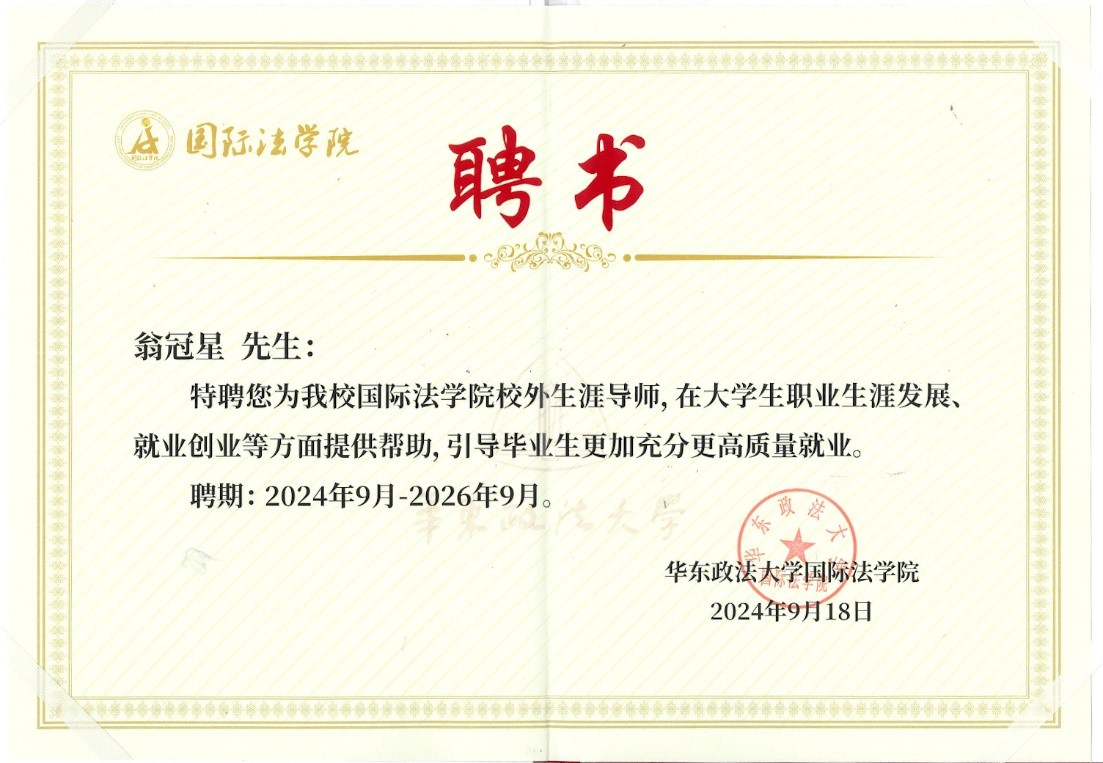 2024年9月18日,华东政法大学国际法学院本科生开学典礼隆重举行。典礼上举办了校外生涯导师受聘仪式,功承瀛泰律师事务所合伙人、临港办公室主任翁冠星律师受聘为国际法学院校外生涯导师。