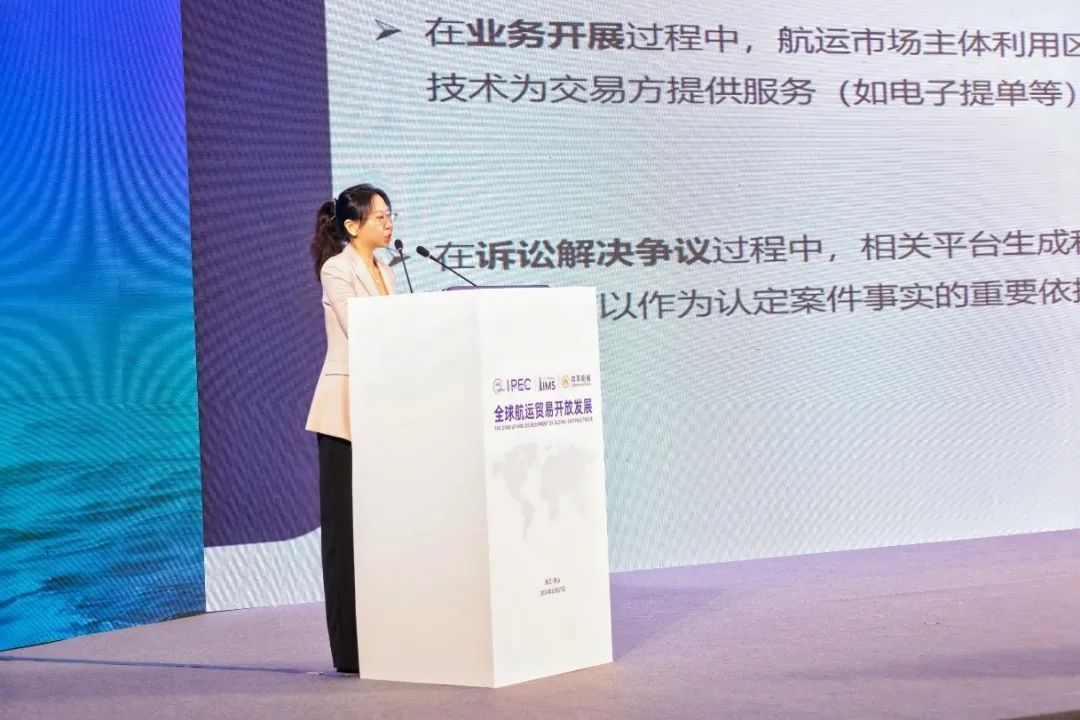 冯忞律师从数字时代的航运与贸易角度展开,分析了传统纸质提单的使用困境与现今电子提单的使用和发展,阐述了国际与国内电子单证立法的现状与趋势,并从专业的视角介绍了区块链电子数据的法律地位、上海海事法院区块链证据审查指南以及区块链技术平台的合规审查机制等内容,为与会者充分展示包括电子提单在内的电子单证对于国际航运贸易业数字化转型的重要意义。