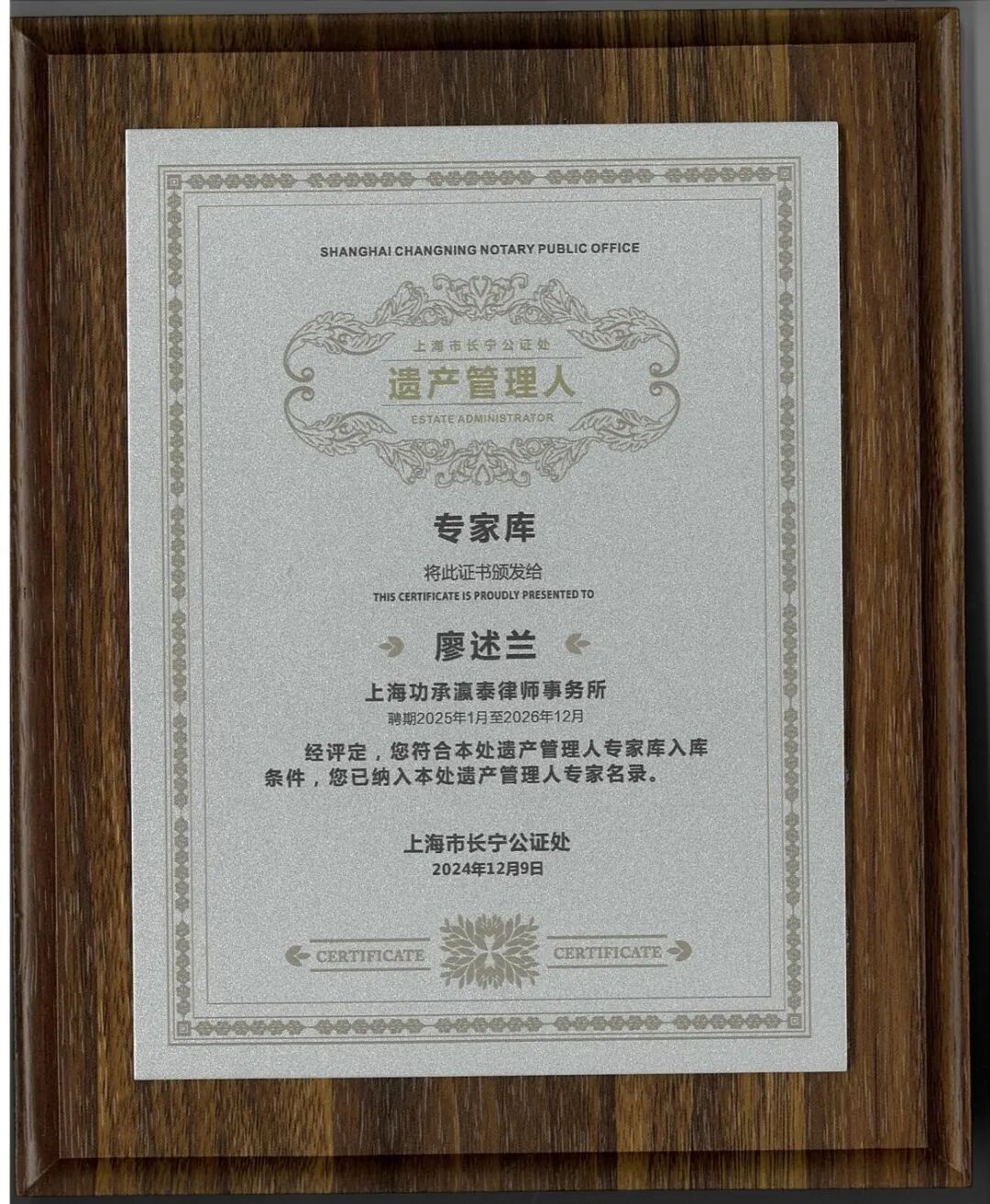 近日,上海功承瀛泰律师事务所凭借在婚姻家事法律领域的专业实力和卓越服务,成功入选上海市长宁公证处遗产管理人推荐名录。同时,我所合伙人、婚姻家事业委会主任廖述兰律师,合伙人、婚姻家事业委会秘书长蒋叶萍律师,婚姻家事业委会副主任胡爱律师入选上海市长宁公证处遗产管理人专家名录。