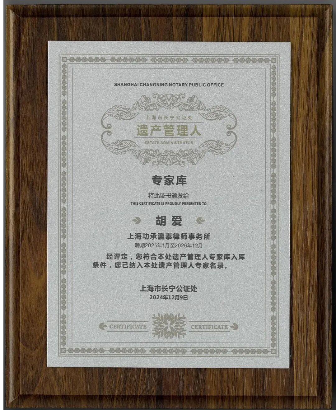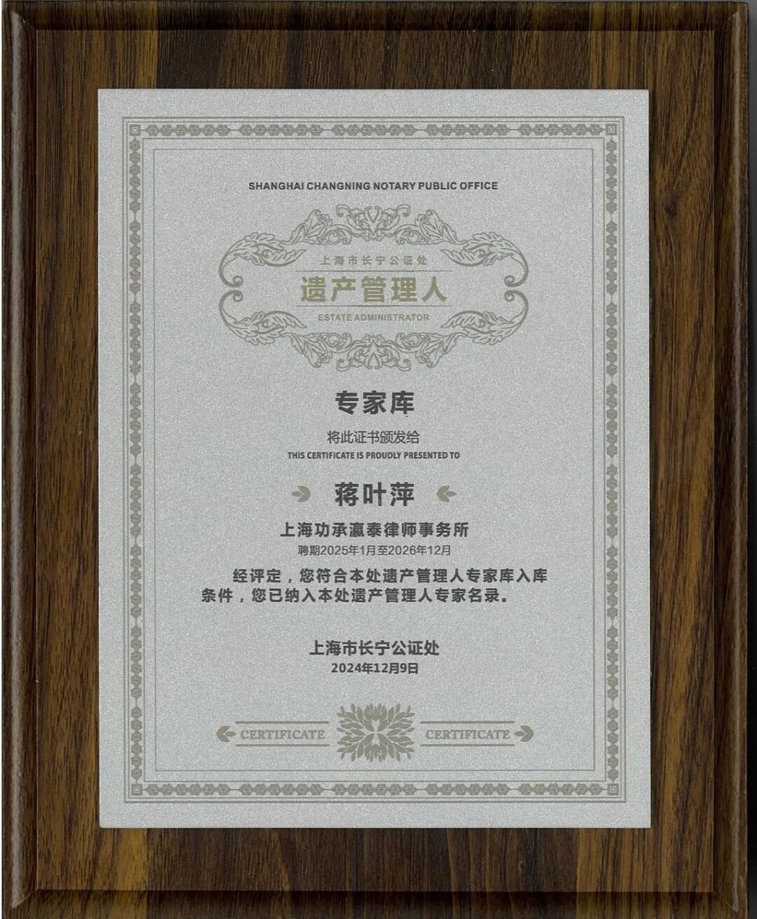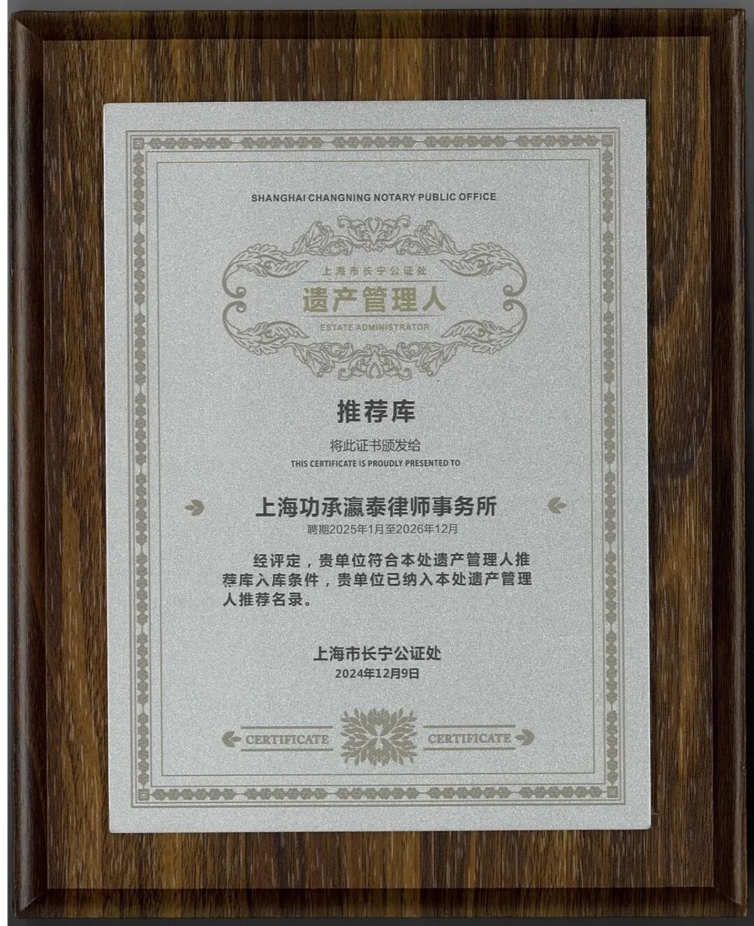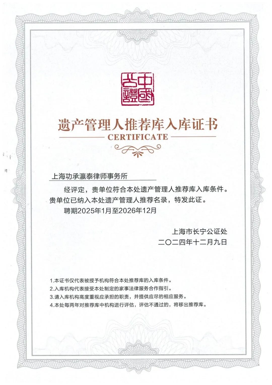 此前,功承瀛泰已入选张江公证处、临港公证处、徐汇公证处遗产管理人推荐库,本次入选长宁公证处遗产管理人推荐库,是对功承瀛泰专业实力与服务能力的再次肯定。我们将致力于促进家庭关系的和谐,推动家庭财富的合法传承与规范管理,为维护社会稳定和可持续发展提供专业支持。
