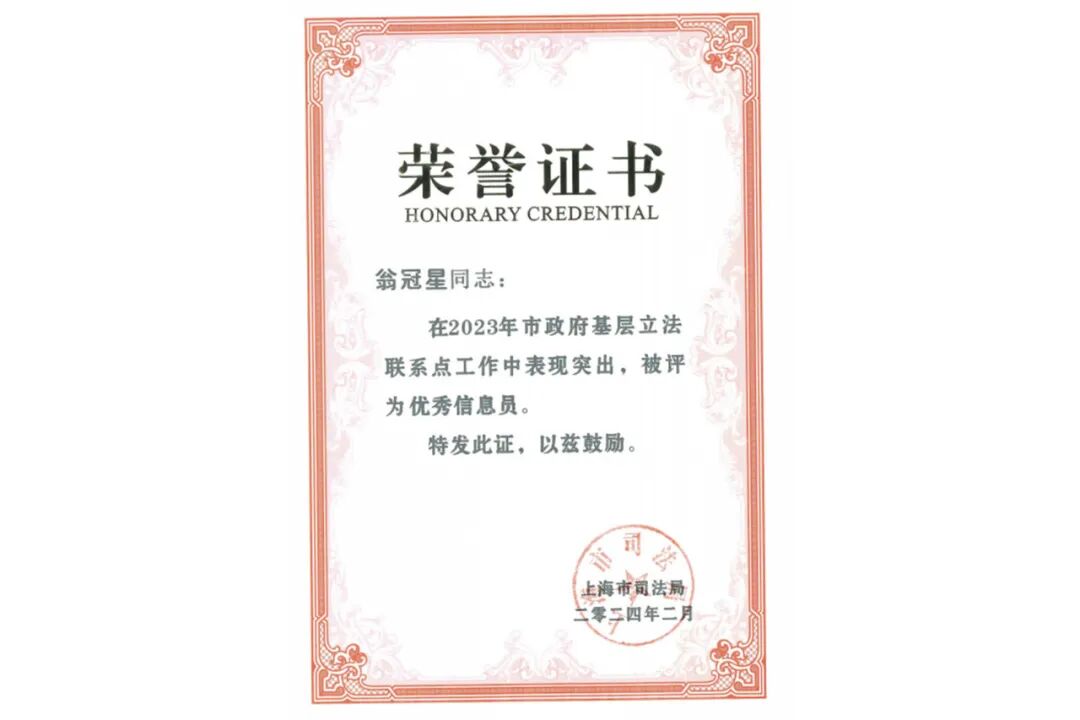 过去一年,上海功承瀛泰律师事务所基层立法联系点还参与了多个立法项目:开展“商业秘密保护”立法调研,推动企业创新与核心竞争力提升;开展“数据要素立法与试点推广工作”调研,为数据合规流通和价值挖掘提供法律保障,服务数字经济发展;举办“航运绿色能源”立法论证咨询会和“国际航运中心建设”地方性法规征求意见座谈会,提出专业建议,助力绿色航运发展和国际航运中心建设;开展《健康医疗数据流通利用的制度型开放路径探析与实践策略》课题研究,推动数据合规高效流通,促进科技与健康产业融合发展。此外,事务所在“残疾人就业辅导员制度”立法项目中提出完善就业保障体系的建议,彰显社会责任,并与浦东新区高行镇基层立法联系点签署战略合作协议,搭建多元参与的法治平台。我所合伙人、临港办公室主任翁冠星律师凭借在市政府基层立法联系点工作中的突出表现,被上海市司法局评为“优秀信息员”。通过覆盖多领域多行业立法项目,功承瀛泰为浦东新区打造社会主义现代化建设引领区、服务国家重大战略部署贡献了智慧与力量。