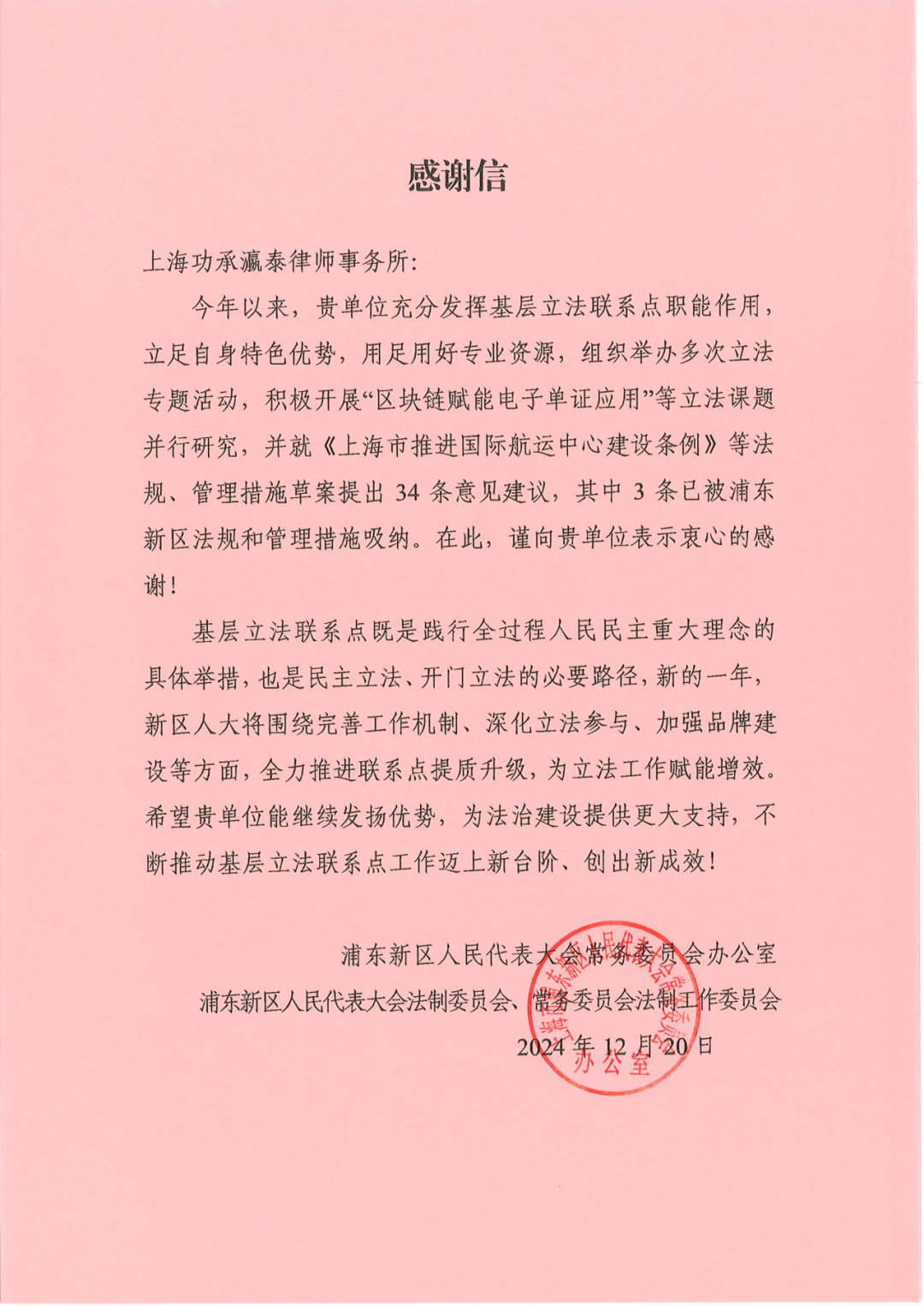 2024年,功承瀛泰律师事务所紧密围绕上海 “五个中心”建设,充分发挥基层立法联系点的桥梁作用,依托专业优势和实践经验,积极和深度参与了浦东新区涉及经济、金融、贸易、航运、科技创新等领域的多个立法项目。事务所通过组织立法研讨、开展课题研究、提出专业建议,为多部地方性法规和管理措施的制定提供了有力支持,部分建议被采纳,并收到了浦东新区人民代表大会常务委员会办公室,浦东新区人民代表大会法制委员会、常务委员会法制工作委员会联合发出的感谢信。未来我们将继续砥砺前行,发挥专业优势,为基层立法工作提供更大支持,不断推动基层立法联系点工作迈上新台阶、取得新成效。