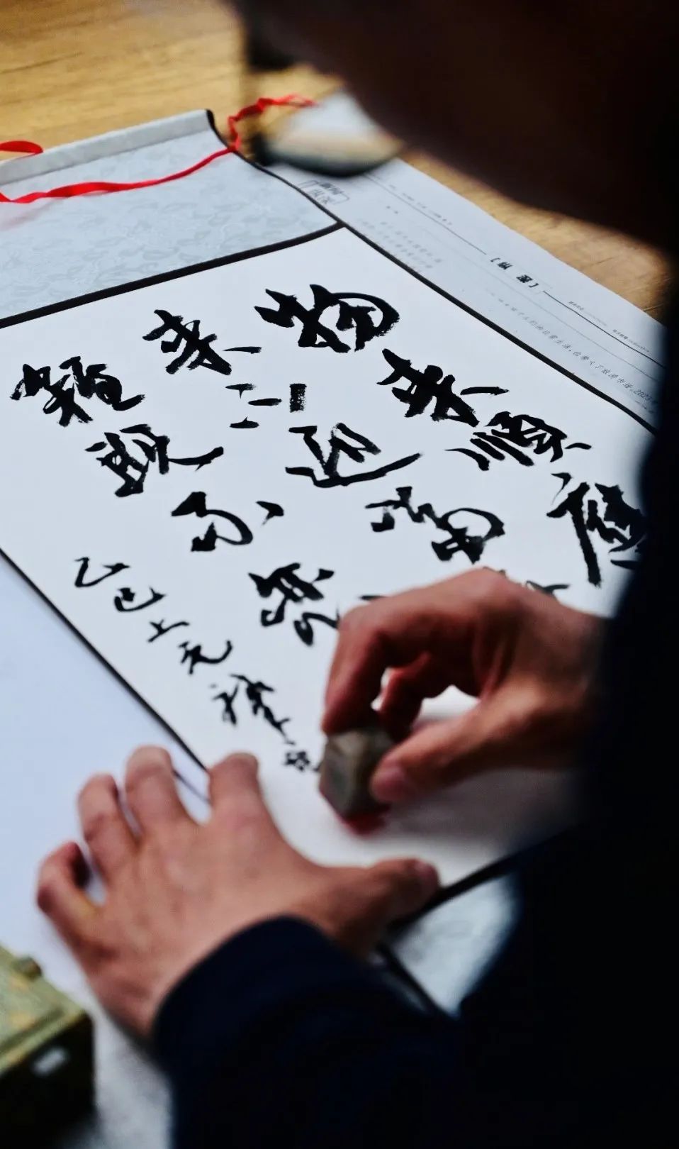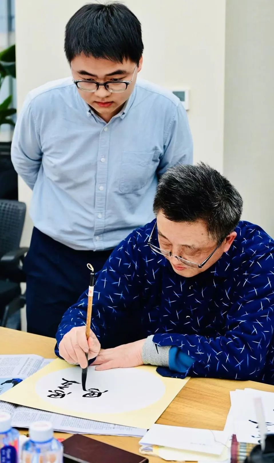 在书画创作环节,律师们从事务所精心准备的卷轴、书签、团扇中选择了心仪的创作纸,而后围聚在书案旁,请书画家为自己写下寄托美好祝愿的字词句段,同时细致观摩笔法,与书画家深入互动交流。六位书画家各展所长,匠心独运,现场创作出了一幅幅独一无二的专属作品。