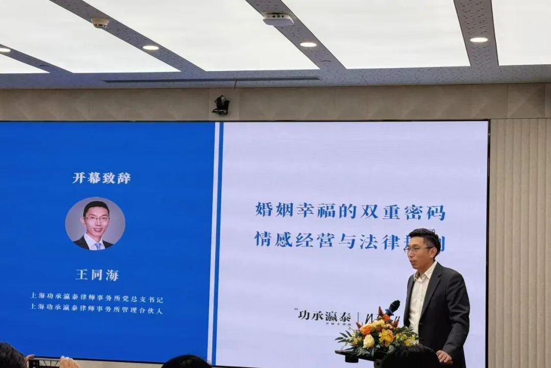活动伊始,上海功承瀛泰律师事务所党总支书记、高级合伙人王同海律师开幕致辞。王同海律师在致辞中表示,功承瀛泰自2005年成立以来始终深耕专业化与品牌化建设。他强调:“婚姻家事委员会作为各地办公室跨区域专业委员会,举办了多项研讨活动。婚姻家事不仅是独立专业领域,更是各业务条线的重要配合和支撑。婚家委开展业务中始终坚持法律守护与情感经营并重的理念。本次活动正是通过明丽老师带来的情感智慧与功承瀛泰提供的法律保障,共同构成现代家庭幸福的双重密码。”他期待通过本次活动,助力既有爱意流淌、又有规则护航的婚姻关系。