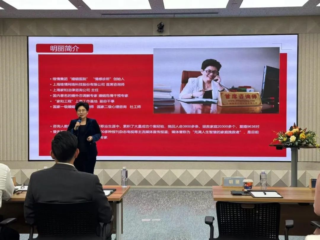 在主题分享环节,维情集团“婚姻医院”“情感诊所”创始人,上海维情网络科技股份有限公司首席咨询师明丽老师以《幸福家庭的经营秘诀》为题进行了深入分享。明丽老师以 27 年婚姻咨询经验为依托,分享了“幸福婚姻的11件小事”与“婚姻五面镜子”等理论,并通过真实案例揭示婚姻危机往往源于沟通失效、需求错位或价值忽视。“幸福婚姻的秘诀在于理解、包容与成长”, 明丽老师指出,夫妻需学会“爱的能力”,避免过度控制或自我牺牲,通过同步提升认知、保持精神共鸣,才能将家庭经营为“心灵港湾”。