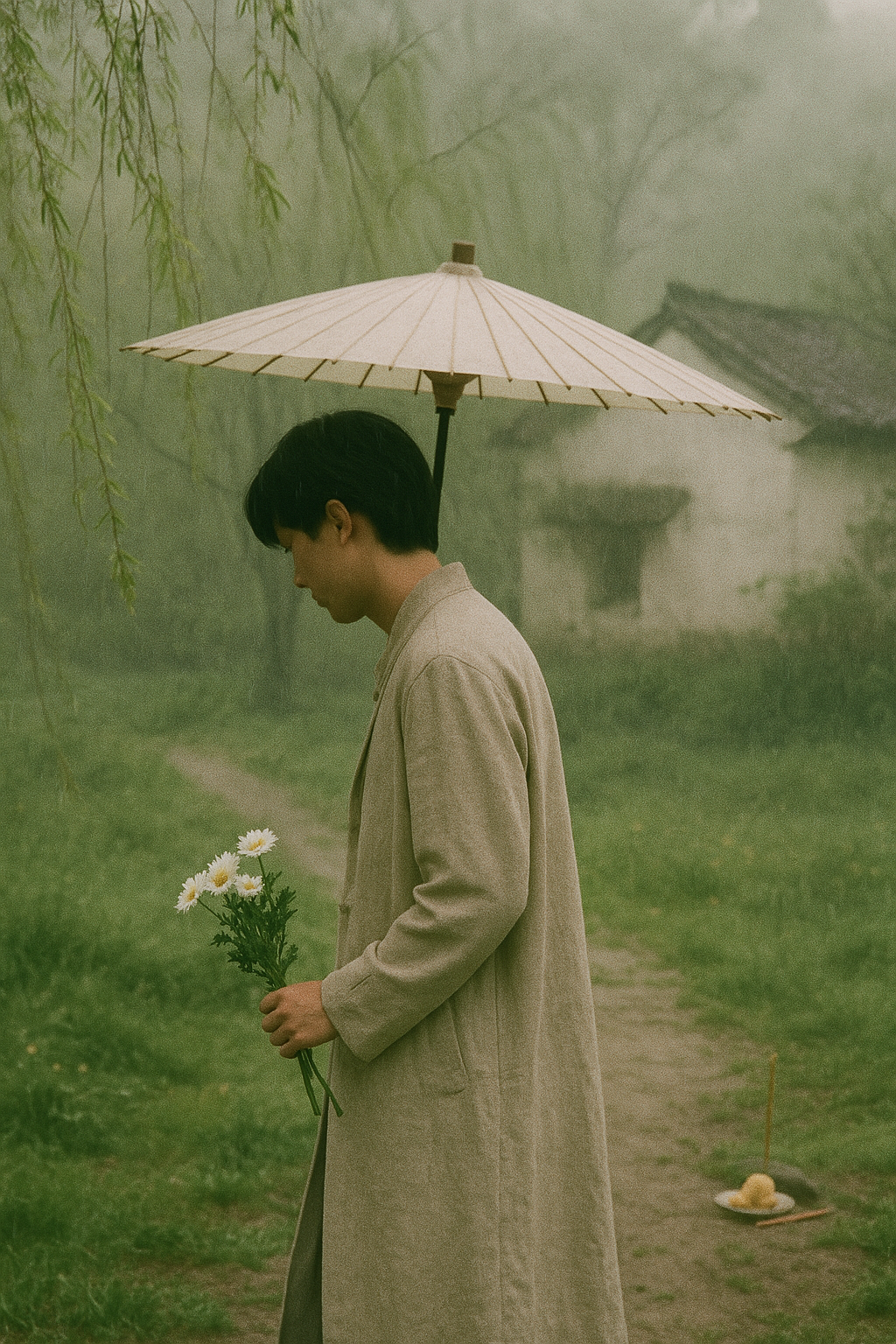 清明细雨蒙蒙,山乡的早春还带着一丝寒意。我随父母沿着蜿蜒的山路来到家族墓地,脚下土路泥泞,夹杂着去年落叶的腐香。放眼望去,青山寂静,薄雾在松柏间游荡,四下只是山谷风声和雨滴敲打树叶的轻响。父亲走在最前,手里提着祭品篮,母亲紧随其后,怀中护着一束野菊和新折的柳枝。我放慢脚步,望着前方二老微弓的背影,心头泛起一阵酸楚,却又倍感温暖——所幸他们依然健在。许久未曾如此远离尘世纷扰,放下凡间繁杂的事务,重回这熟悉的山野,让心绪随山风细雨慢慢沉淀。慎终追远的古训铭刻在这一刻的空气中,我们揣着对先人的思念与敬意,踏着湿润的山土,一步步靠近长眠于此的祖辈。