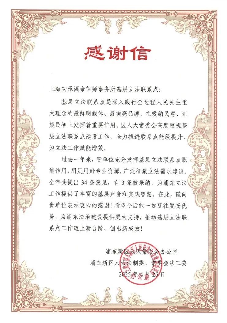 过去一年,功承瀛泰基层立法联系点充分发挥职能作用,用足用好专业资源,广泛征集立法需求建议,提出的多条意见被采纳实施,获得了浦东新区人大常委会办公室、浦东新区人大法制委、常委会法工委高度评价并被授予《感谢信》。展望未来,功承瀛泰基层立法联系点将以更高站位谋划发展:一方面持续深化基层立法联系点建设,通过优化工作机制、拓展合作网络,进一步提升立法调研的广度和深度;另一方面将重点聚焦航运、人工智能等新兴领域,加强专业研究和国际经验借鉴,助力浦东新区打造更具前瞻性和可操作性的法律体系。同时,律所还将加强系统培训和实务锻炼,着力培养“专业+立法”复合型法治人才,为践行全过程人民民主、推动立法工作再创新佳绩作出更大贡献。