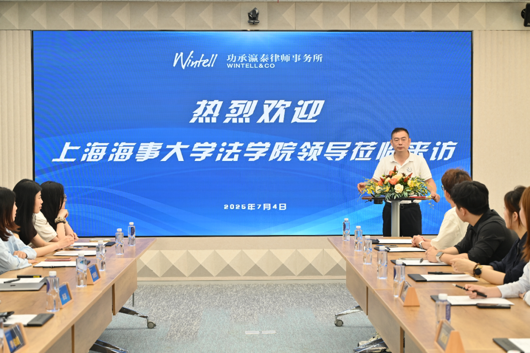 2025年7月4日上午,上海海事大学法学院党委书记王德岭带队赴本所调研交流,随行人员包括法学院副院长高俊涛、党委副书记陈楚瑶等领导及部分在校学生。功承瀛泰律师事务所高级合伙人、上海海事大学法学院教授胡正良,高级合伙人刘雨佳,合伙人张进,律师李伯超等出席座谈。双方围绕法学人才培养、实务课程共建、法律科技融合应用等议题开展深入交流。
